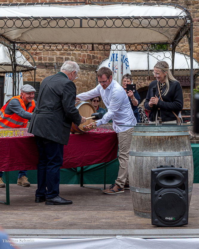 Die Feier, mit historischem Fassanstich durch den Landrat und mit mittelalterlichen Ständen und Darbietungen, fand im Burghof statt. An verschieden Stellen im Ort wurde mehrmals täglich ein Theaterstück (Stationentheater) aufgeführt.